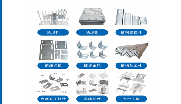 主要产品有:镀锌预埋件、槽钢、幕墙角码、立柱、路灯底座、地脚螺栓、抗震支架、铝合金制品等,来图制作各种规格异型件。